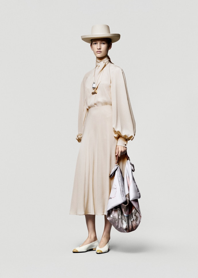 Définie par son col féminin qui se noue à l’encolure, la chemise Valmy allie élégance du mouvement et raffinement du détail. Elle est confectionnée en crêpe de chine de soie légère, tissé d’un motif jacquard de points en relief pour ajouter une profondeur et une texture subtiles. La coupe douce de ses manches raglan s’affine délicatement aux poignets, apportant une structure discrète à sa ligne fluide.